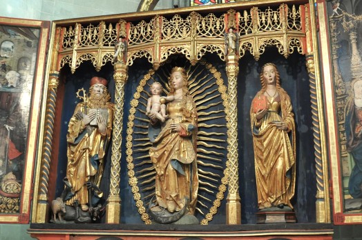 Der Hl. Antonius in der Wiesenkirche steht also nicht allein. Und der Marienaltar betont die besondere Bedeutung des Heiligen. Er ist sichtbar bei geschlossenem Altar und hält die Flamme des Ignis Sacer in seinen Händen. Und im geöffneten Altar steht er als Schnitzfigur im Zentrum neben Maria mit dem Kind, den typischen Stab in Händen und das Antonius-Schwein an seiner Seite. Unter seinem Fuß windet sich eine Kreatur, die Teufel sein kann, gehörnt mit zwei unterschiedlichen langen Hörnern, die an die Form des Mutterkorns erinnern.